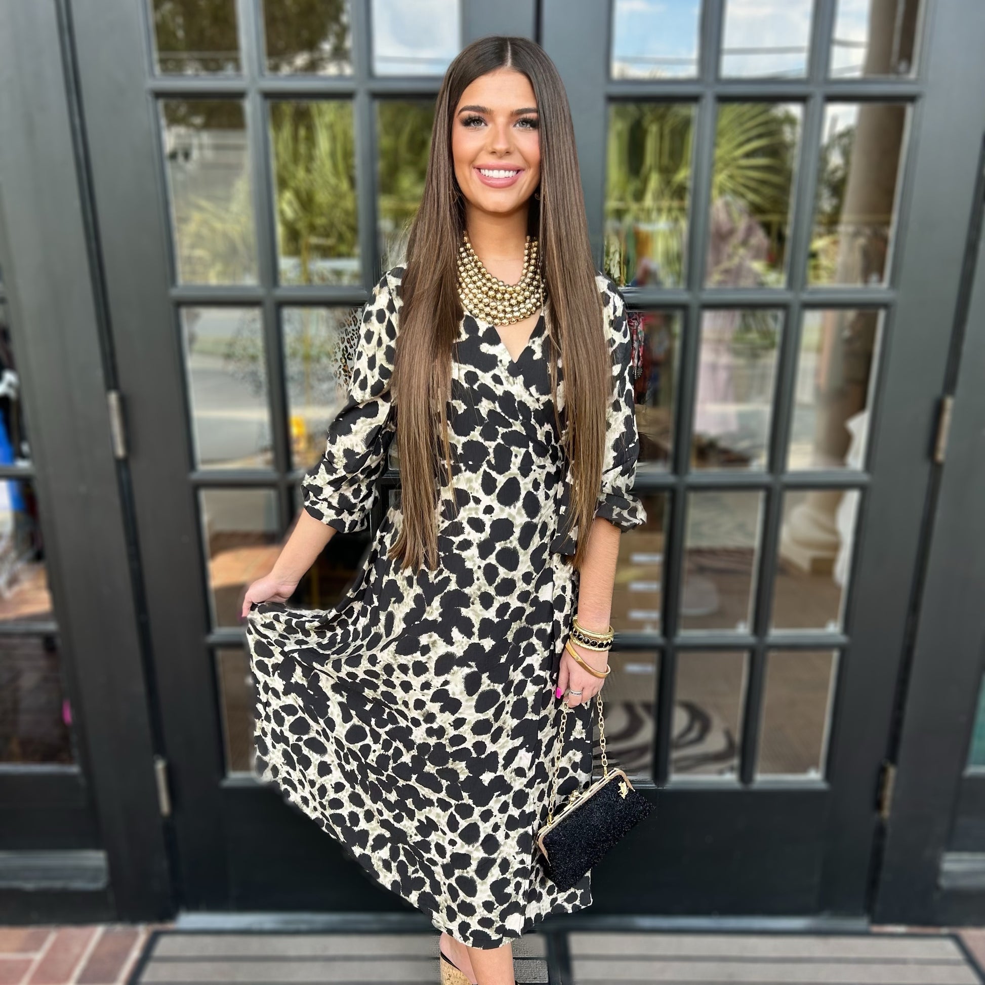 The Kristen Dress in animal print is a must-have for any fashion-forward individual. This long wrap dress boasts a classy and stylish design with a crossed V-neckline and a waist-cinching belt. The long sleeves with elasticated cuffs, along with the slit, add a touch of sophistication. Turn heads from day to night in this versatile dress.