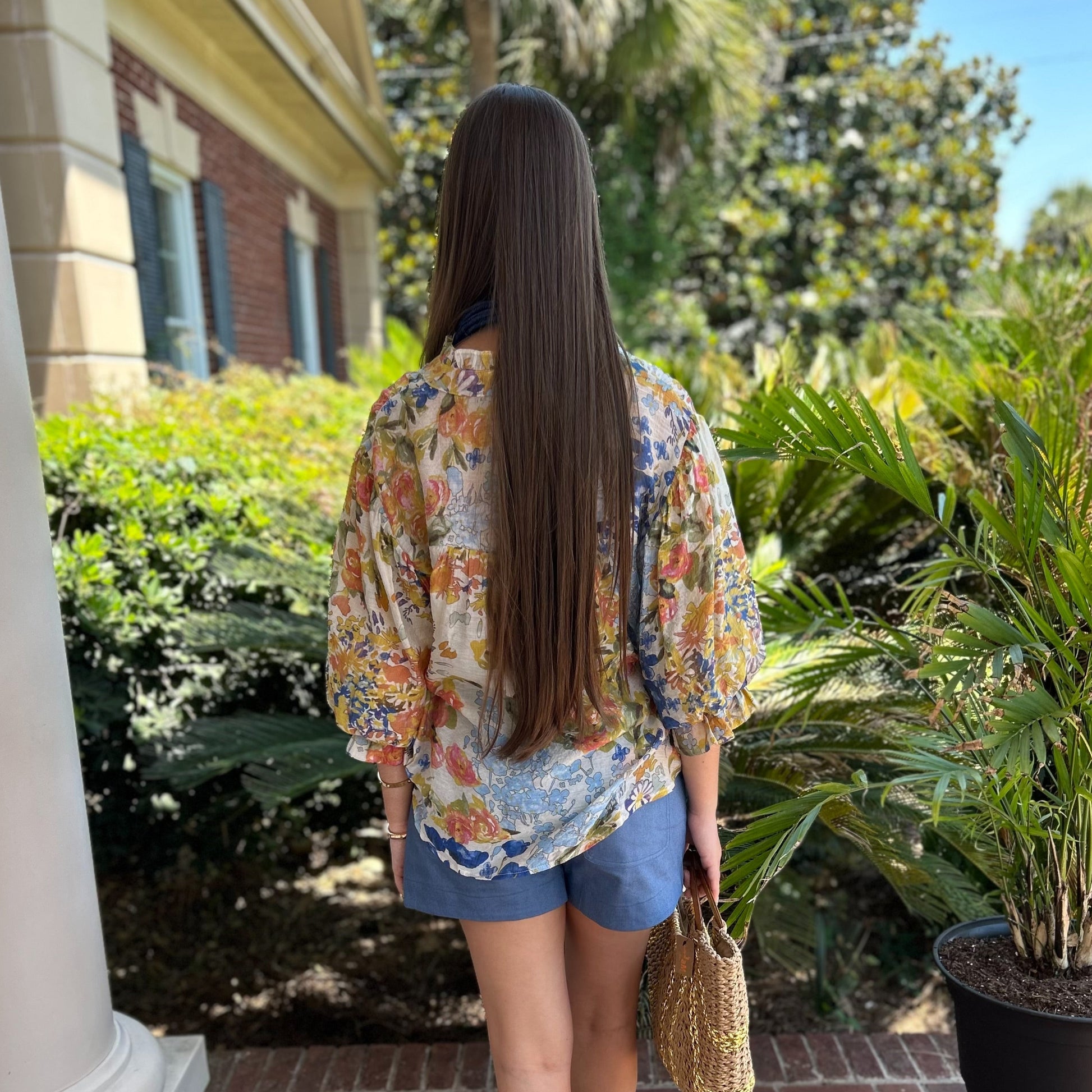 Paired with the Sailor Shorts in Denim, the Rope Statement Necklace in Navy, and the Straw Handle Bag.