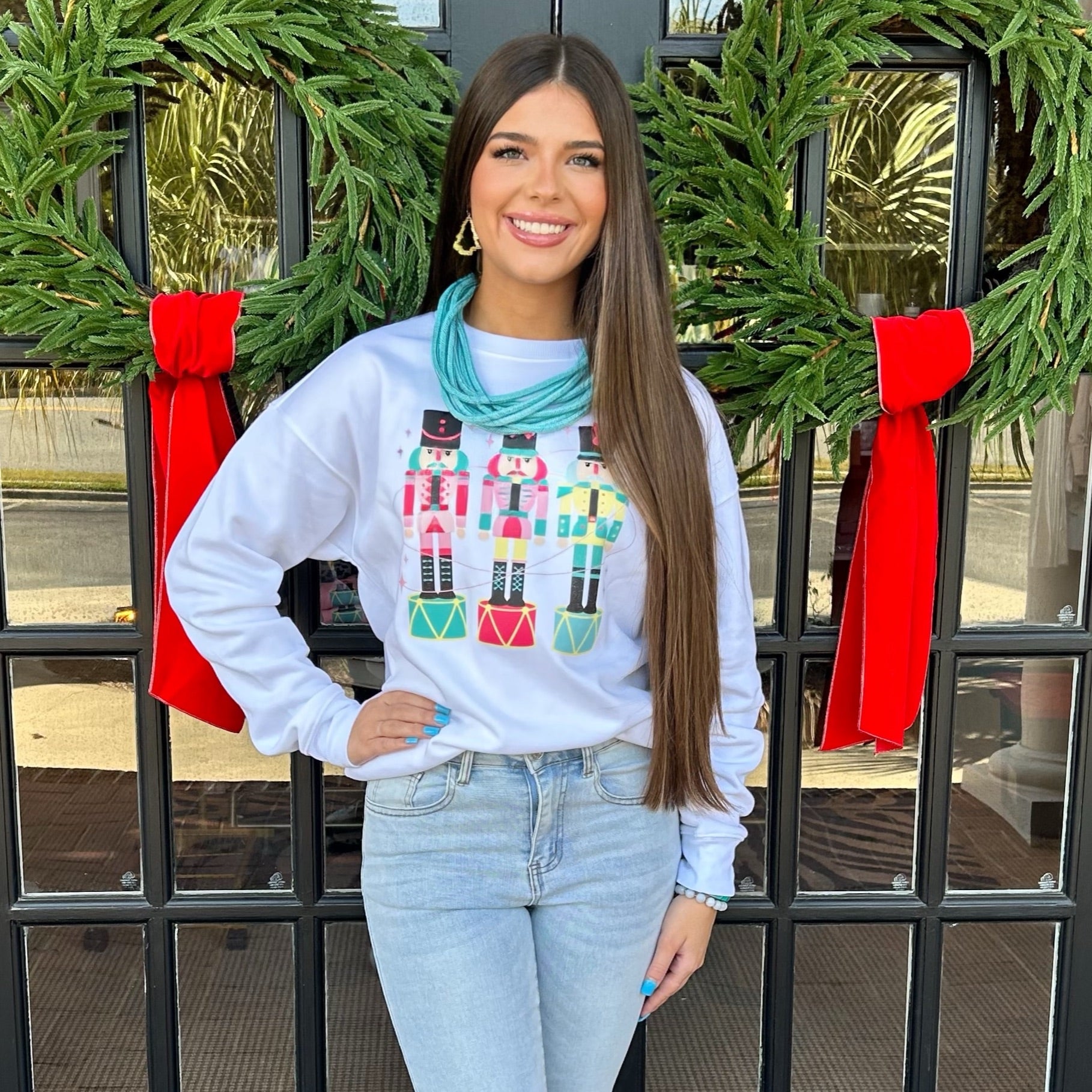 Stay cozy and cute this holiday season in the Nutcracker Trio Sweatshirt in Ivory. Made with a relaxed fit and crew neck design, it's both comfy and festive. Perfect for any holiday occasion, this sweatshirt will keep you holiday ready all winter long.