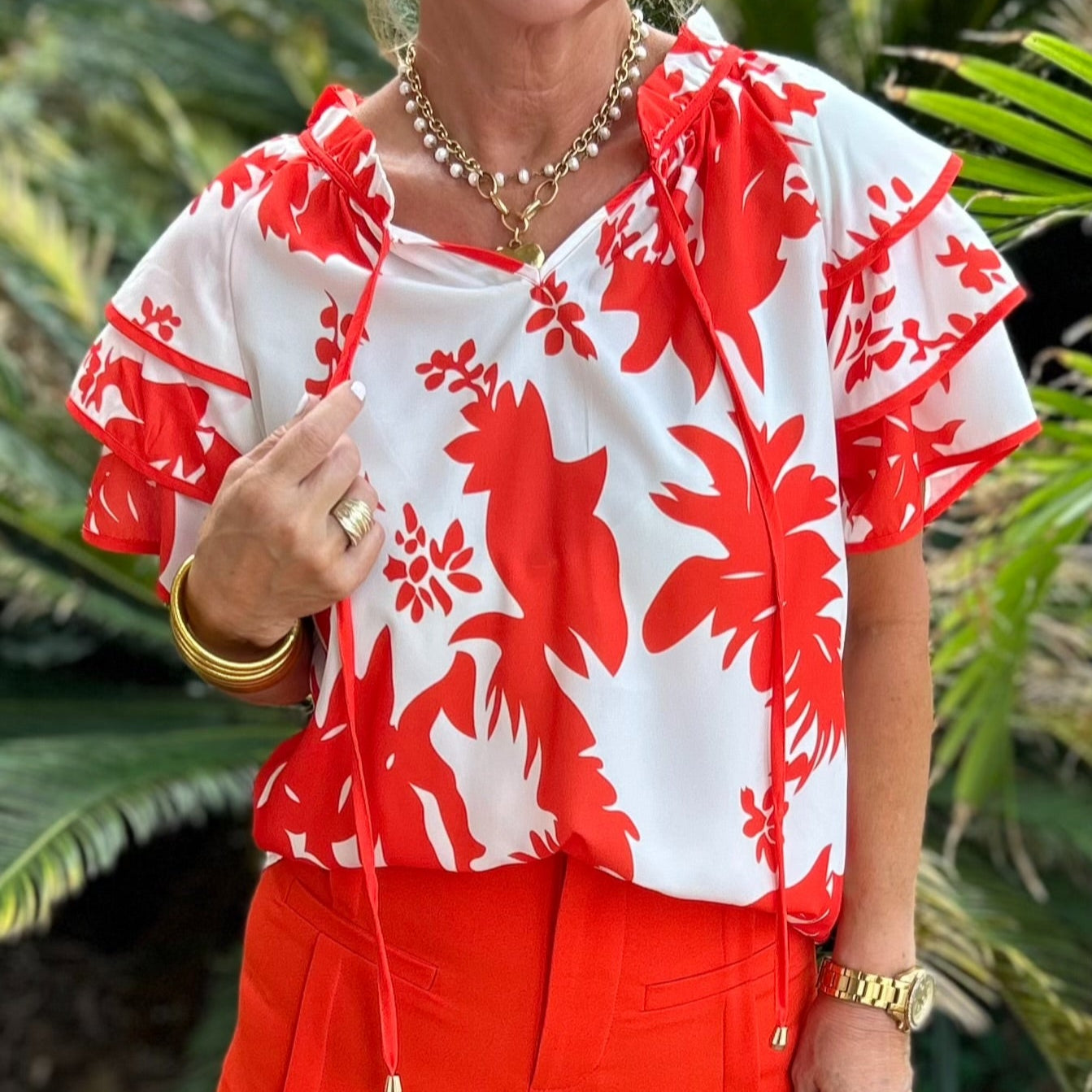 The Stella Top in Red & White boasts a trendy floral print, perfect for summer fun. Its tiered ruffle sleeves add a touch of femininity. Expertly crafted with quality materials, this top is a must-have for any fashion-forward wardrobe.
